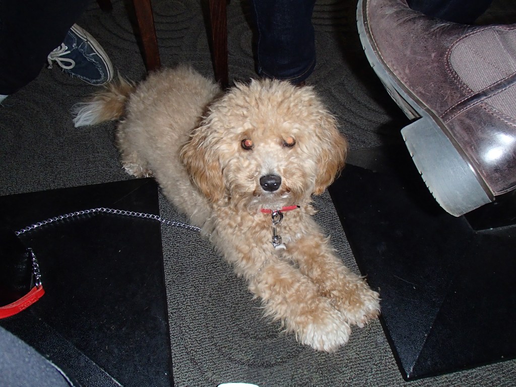 Here I am hiding under the table at Oscar’s in Calverton. Hum booked to go with family for a pre-Mother’s Day lunch so a Saturday lunchtime. She checked if it was OK to bring a dog and they said ‘yes’ on the phone.